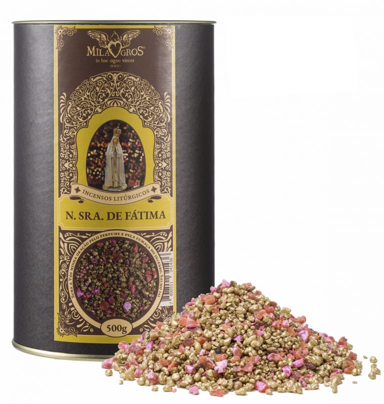Barril de 500g contendo incenso dedicado a Nossa Senhora de Fátima. Desenvolvido pela Milagros para a entronização da imagem de Nossa Senhora Aparecida na Basílica de Nossa Senhora de Fátima, em Portugal, foi utilizado pela primeira vez em 13 de maio de 2015.